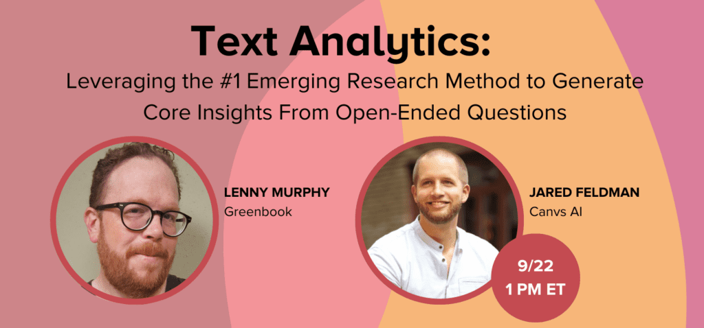 GreenBook’s Chief Advisor for Insights and Development, Lenny Murphy, and Canvs AI Founder & CEO, Jared Feldman will present on the state of text analysis in insights as part of the DIY research movement during an upcoming Greenbook Webinar: Leveraging the #1 Emerging Research Method to Generate Core Insights from Open-Ended Questions on Thursday, September 22nd at 1 pm ET.