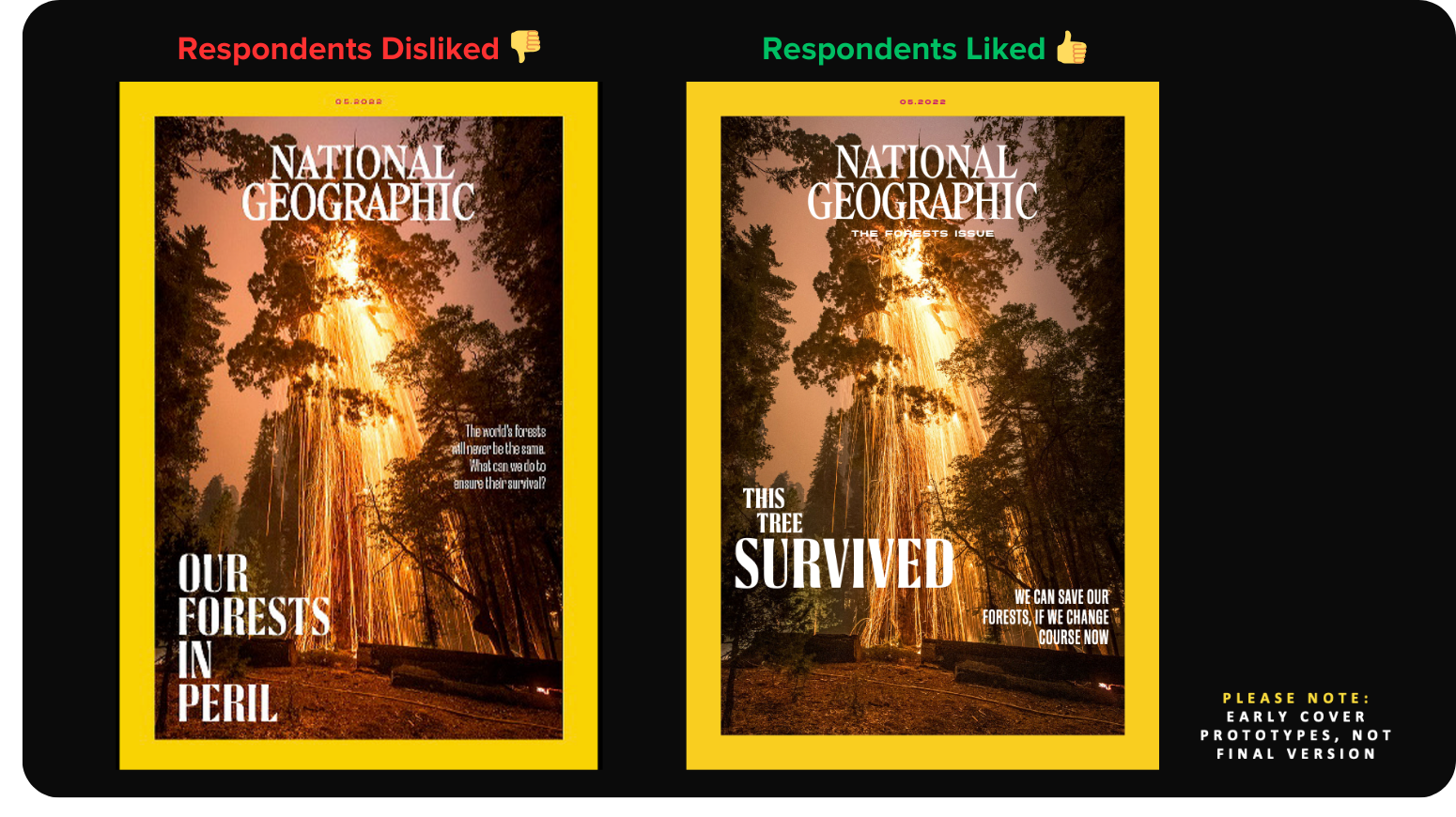 The cover on the right was the favorite because it expressed hope and survival, as opposed to the cover on the left which was more pessimistic. Based on the churn survey analysis, the team found that National Geographic readers are interested in current events but prefer a positive angle in the stories.
