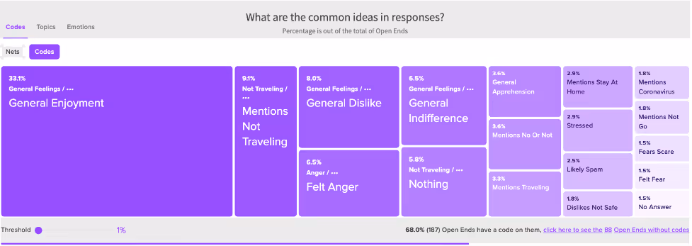 It’s complicated…Limitations on travel have been one of the defining aspects of the pandemic. The most recent surge in Omicron Covid-19 is an unfortunate microcosm of the complex public health environment that we’re navigating. Just as many vaccinated Americans were planning their holiday travel, this new, more virulent variant emerges. These rapidly-evolving circumstances are likely to generate volatility in consumer sentiment and behavior, ones that are important for brands to understand. To better understand how consumers are feeling about holiday travel this year, we fielded a simple, one-question open-ended survey with a national, general population sample via Google Surveys. We asked: “Please describe how you feel about holiday travel this year.” At the time of this writing, we had collected 314 responses.One of the selling points of Canvs is the ability to extract both emotion and codes and topics from open-ended text and to do so quickly and accurately. So while most customers wouldn’t field a survey with only open-ended questions (would they?), we can actually extract quite a bit of information from a single open-ended question. Let’s take a look.Twenty percent (20%) of respondents indicated that they are not traveling. While not dispositive as an indication of the percent who are traveling (or not), this kind of categorical coding is helpful if we want to specifically look at the emotional response or sentiment of those who indicate their not traveling. Obviously, the addition of a closed-ended response as a filter or cross-tab here would provide a more accurate way of creating a cohort.