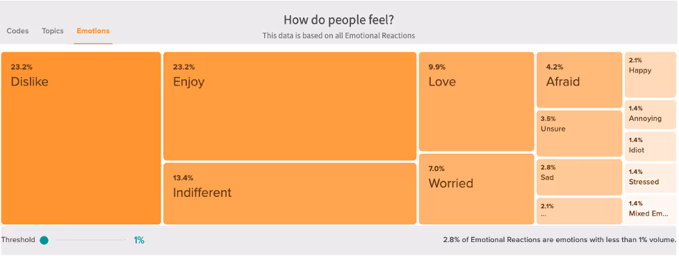 - The highest emotional response is split evenly between Enjoy and Dislike (23% of emotions)