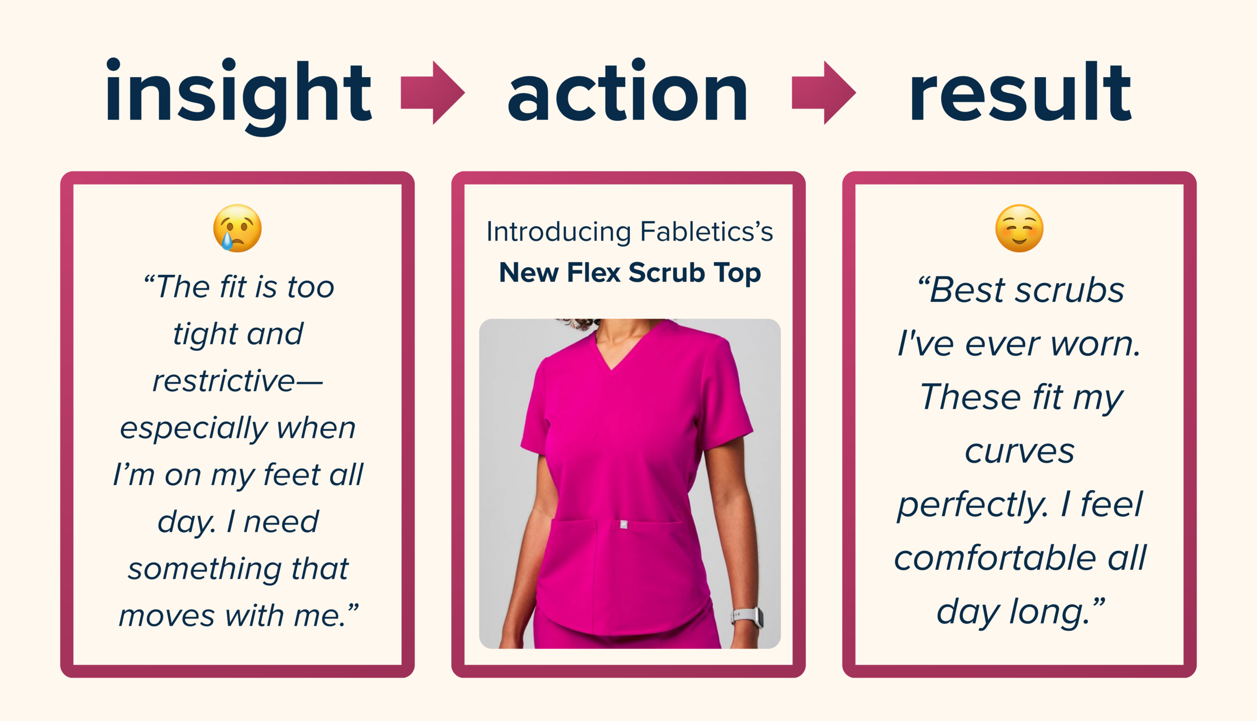 To scale their impact and make sense of high volumes of unstructured feedback, Fabletics partnered with Canvs to automate and enhance the analysis of qualitative data. With Canvs, the consumer insights team was able to apply consistent code frames to open-ended survey responses, allowing them to monitor shifting sentiment over time and surface emerging themes for the executive team. For example, Canvs revealed that customers were frustrated with the fit of their scrubs—especially curvier women expecting the stretch of activewear. This insight directly led to the development of a new product: the Flex Scrub Top, now one of their top-reviewed items. Additionally, Fabletics began aggregating and analyzing product reviews at the style level, helping merchandising teams make informed updates to sizing, fit, and fabric choices.Fabletics uses Canvs for: