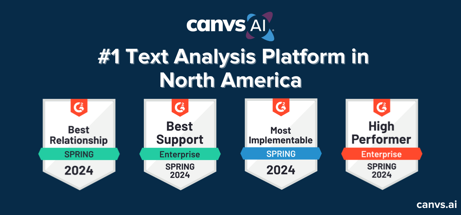 April 11, 2024 — Canvs AI, the leading insights platform built for text analysis, is now ranked as the #1 text analysis solution in North America by G2, the leading software user review site. Canvs AI was recognized as the leader in the G2 Spring 2024 Relationship Index for Text Analysis. The G2 Relationship Index score is based on a proprietary algorithm that factors in real-user satisfaction ratings for a number of relationship-related review questions, including the quality of support, likelihood to recommend and ease of doing business.“I’d like to thank the incredible Canvs AI community of customers for making Canvs the number one text analysis platform in North America!” said Jared Feldman, Founder & CEO of Canvs AI. “The recognition of our market-leading customer satisfaction and support demonstrates how important it is for organizations to work with partners they can trust as they navigate their path to AI adoption.”As more and more consumer feedback comes in the form of unstructured data, text analysis has emerged as a critical capability for consumer insights and customer experience teams. However, Forrester’s 2023 State Of VoC And CX Measurement Practices Survey reveals that despite nearly all VoC programs (96%) regularly collecting and analyzing surveys, “only 50% are effective at collecting solicited unstructured feedback (like survey verbatims).” Recognizing this critical gap, Canvs pioneered the application of AI to solve for the cost and complexity of text analysis for insights and CX teams, democratizing insights from open ends with a high-trust approach to AI.In addition to being named the Relationship Index Leader for Text Analysis and the top-ranked text analysis platform for customer satisfaction in North America, Canvs AI was named as the leader in the Implementation Index for Text Analysis.To learn more about the Canvs AI platform, take an interactive product tour and request a personalized demo, please visit https://canvs.ai/canvs-ai-platform.