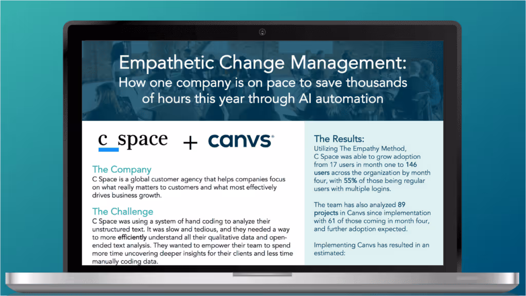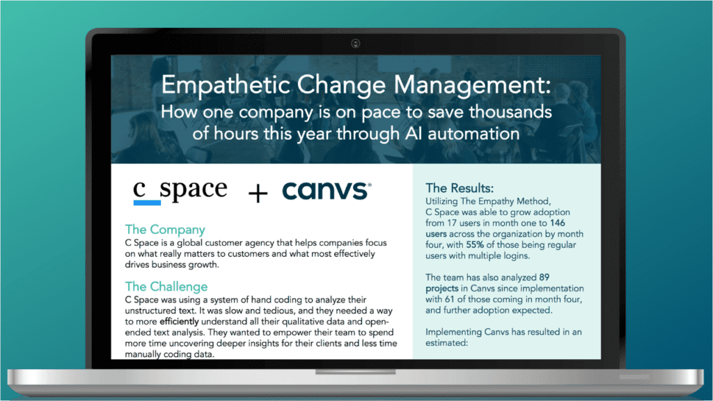 C Space, a leading global customer agency required the use of Canvs AI across their entire organization to more efficiently understand all of their qualitative data and open-ended text analysis. In just 4 months, they’ve saved 267 hours and improved their margin by 28% per project. Learn more about how they successfully implemented new technology across their entire organization through Empathetic Changed Management.