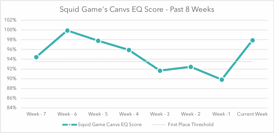 Despite the original Squid Game series breaking the record for spending the most amount of time at the top of Canvs’ OTT Power Rankings, in the past three weeks, the show had fallen to second place behind other popular streaming programs such as Arcane and Stranger Things. With the release of Mr. Beast’s version of Squid Game, the original program not only improved to the top of Canvs’ Rankings but had its second-most successful week since the release of the series. The Netflix Original surged 8% in the Canvs EQ Score the same week that Mr. Beast’s version of the program launched.