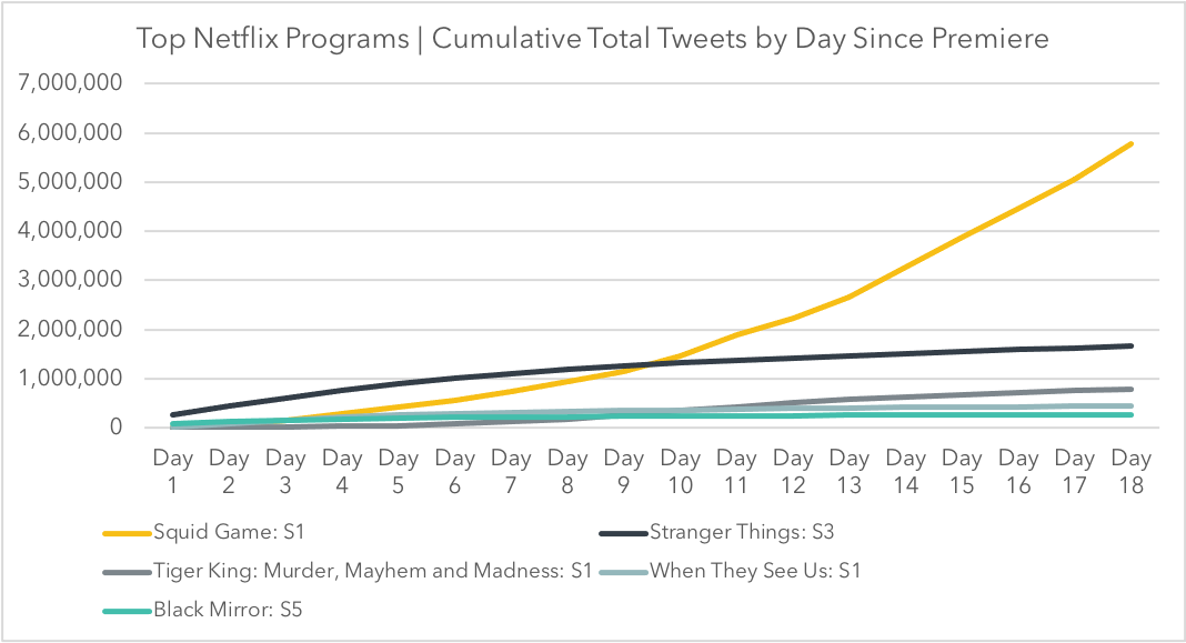 Squid Game launched on Netflix as one of the most successful releases ever on the streaming platform, easily outpacing every show released in the last two years in Total Tweets and Emotional Reactions, while driving an extremely emotionally engaged fan base.