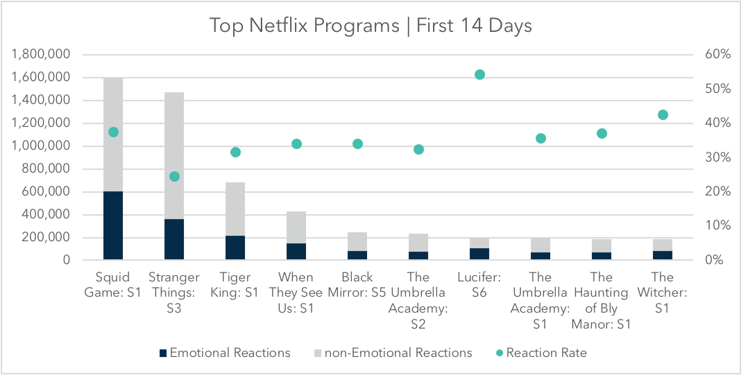Within its first two weeks live on Netflix, Squid Game had already outpaced every Netflix show over the last two years, earning over 1.6M Total Tweets and 600K Emotional Reactions, for a Reaction Rate of 38%.