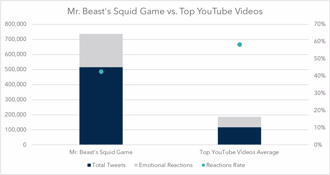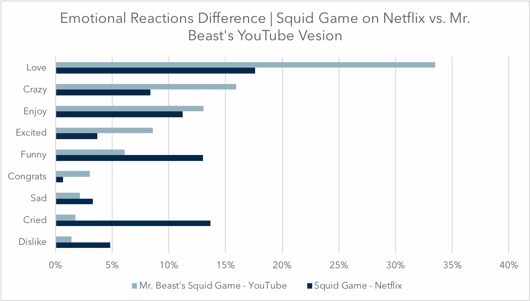 Mr. Beast’s YouTube version of Squid Game was much more likely to drive Emotional Reactions such as Love, Crazy, Enjoy, and Excited, with viewers extremely impressed with his ability to recreate the original program.