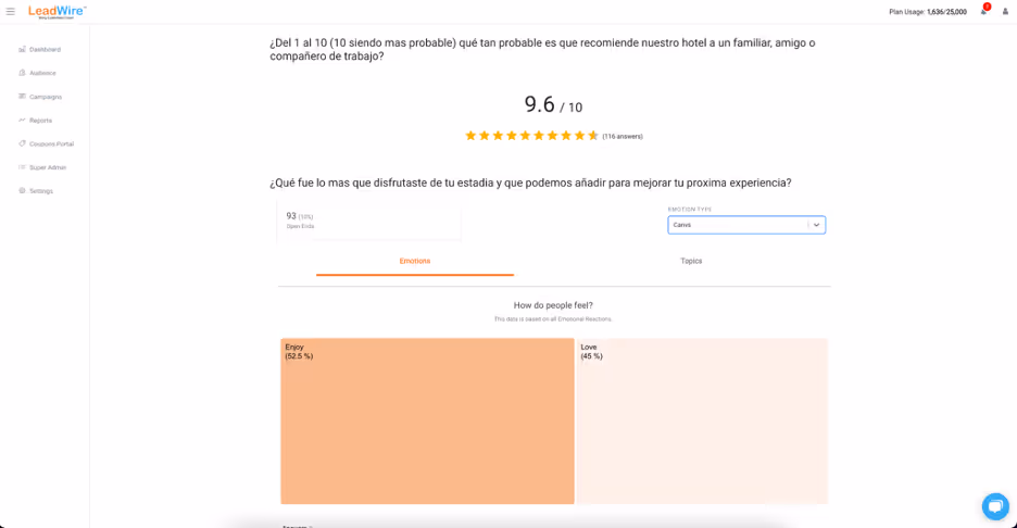 In one example, a resort used LeadWire to survey its customers about their guest experience following a recent stay. The resort was able to analyze the comments using Canvs to identify aspects of the resort that were driving guest satisfaction, as well as areas for improvement. They’re also able to measure the emotions guests expressed about their stay and the factors driving these reactions.