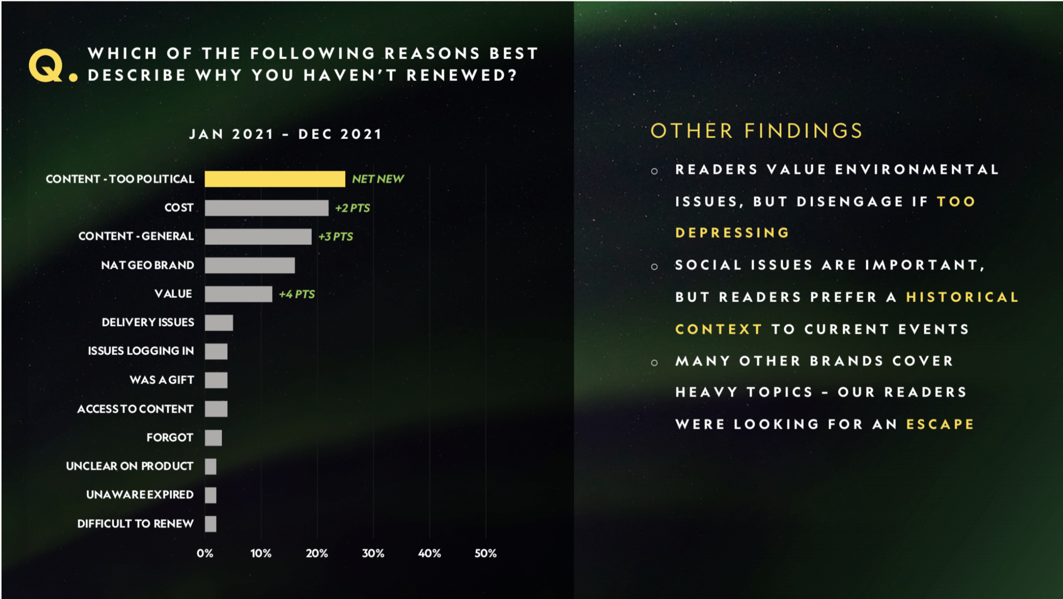National Geographic also captured critical, nuanced feedback regarding the brand permission of their content. For example, readers value environmental issues but disengage if the coverage is too depressing and that readers prefer a historical context to current events.