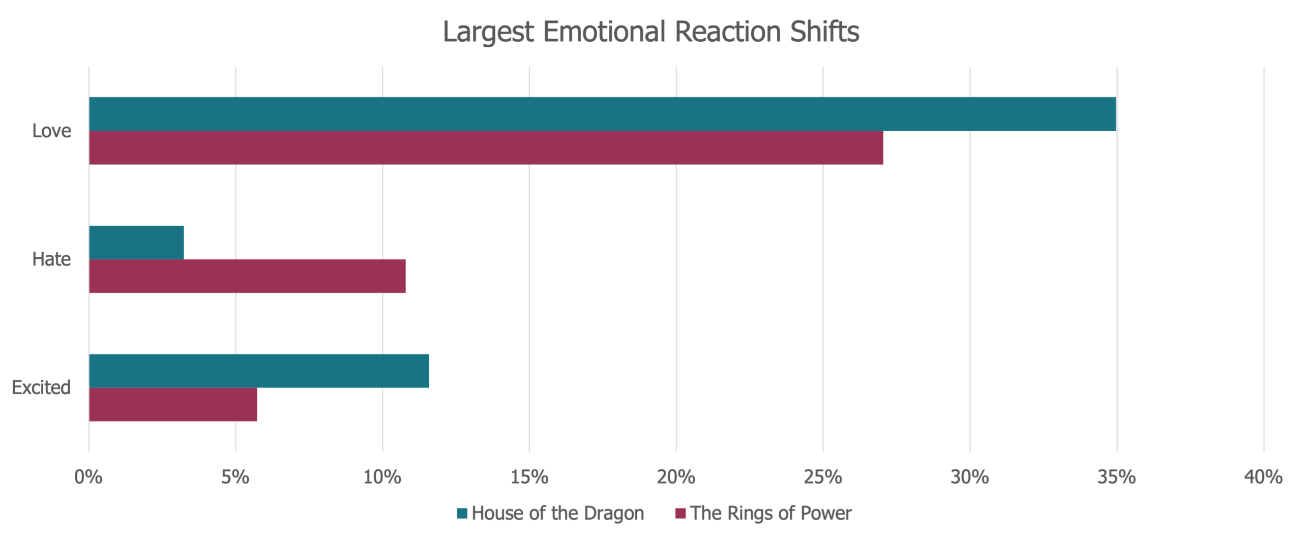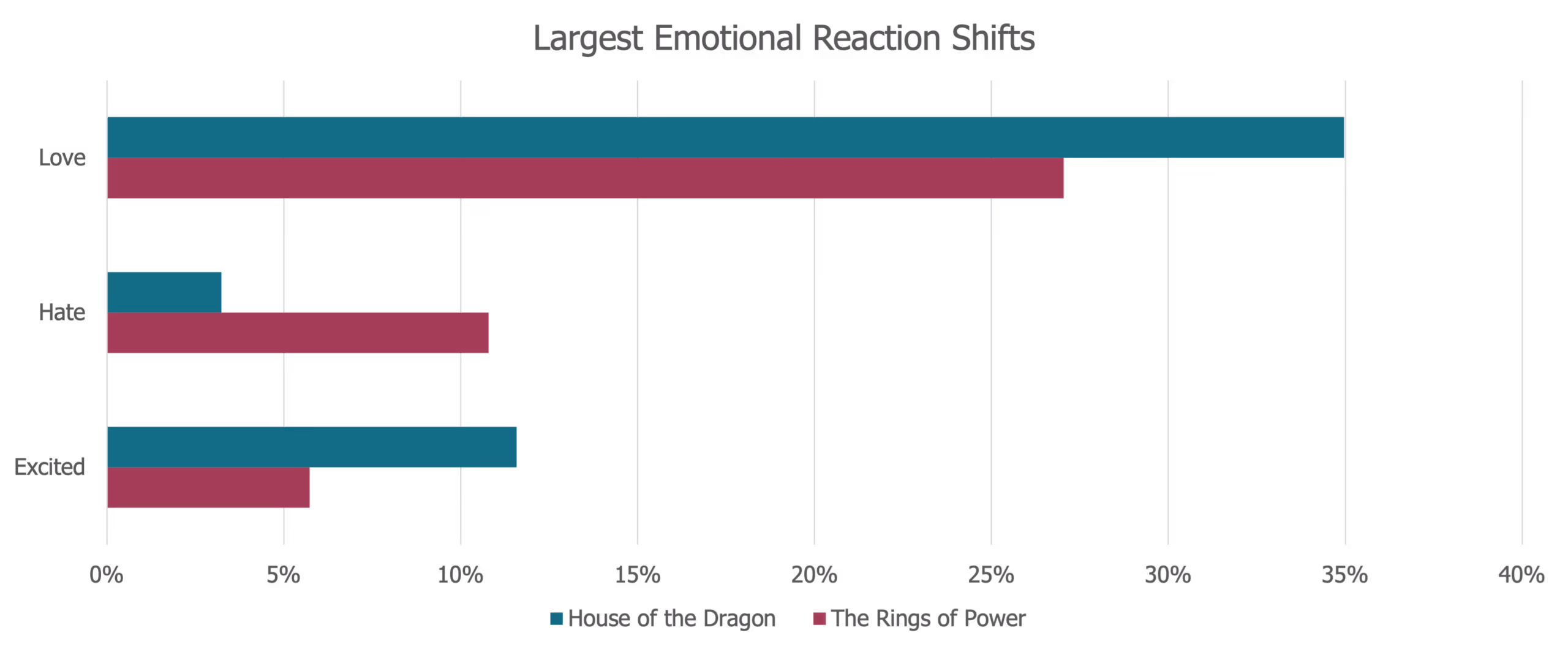 The largest shifts in Emotional Reactions between the two series are in Love, Hate, and Excited. House of the Dragon earned 8% and 6% higher rates of Love and Excited Emotional Reactions respectively, where The Rings of Power saw 8% more Hate Emotional Reactions.