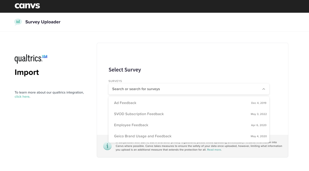 We’re excited to announce that Canvs has released a new Qualtrics connector for Canvs MRX!Canvs is on a mission to help insights and CX professionals transform open-ended text into core consumer insights. As a “bring-your-own-data” insights platform built for analysis of open ends, Canvs generally sits in the middle of the research workflow, making easy ingest of data and output of analysis (data and visualization exports) critical to our customers’ success. With this release, we’re providing streamlined access to one of the world’s leading research and customer experience platforms, and delivering on one of our most-requested enhancements.Using the connector requires no coding. Users with a Qualtrics account simply authenticate with their Qualtrics API credentials to establish the initial connection (figure 1). Once configured, users can select a Qualtric survey to import to Canvs (figure 2), with the ability to define which open- and close-ended responses are made available for analysis as part of our standard data import workflow.