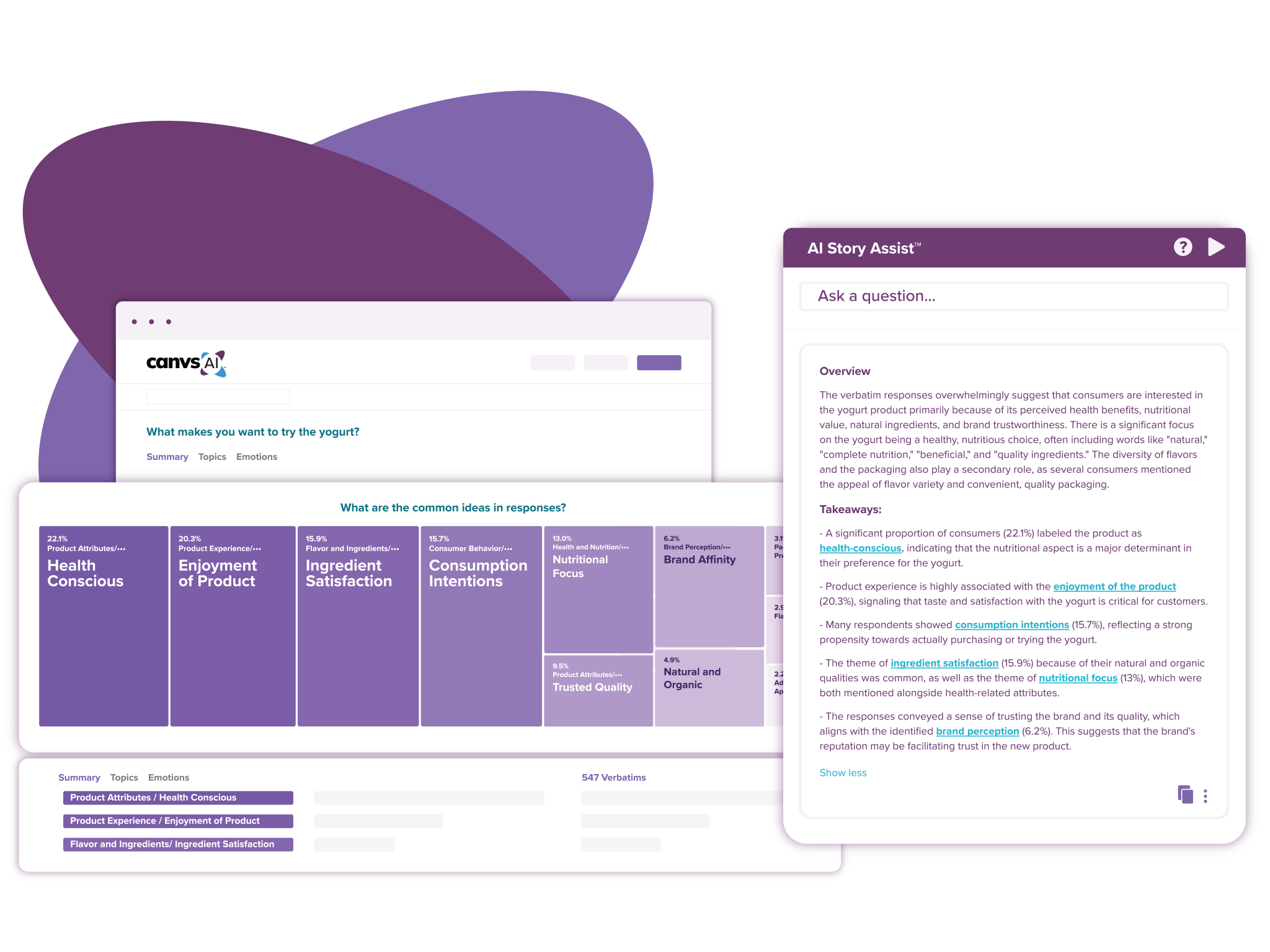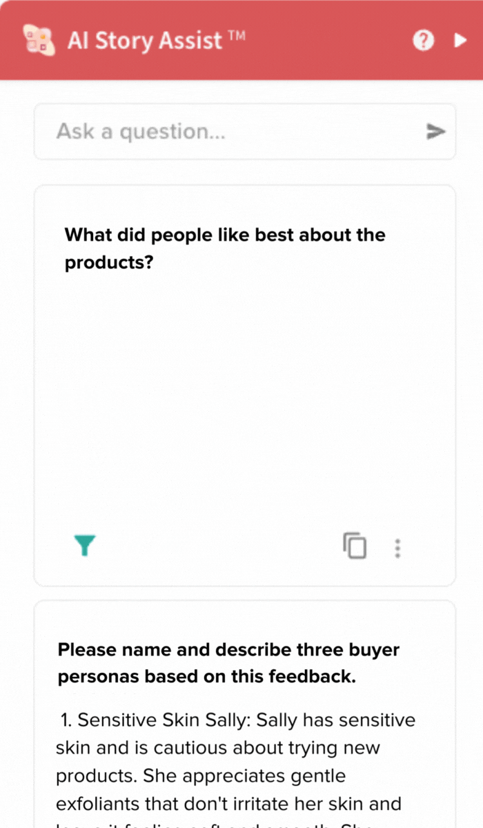 Arm your stakeholders with insights from the ones that matter most—your consumers. AI Story Assist helps you weave their feedback and suggestions into a compelling narrative that will guide your teams to make decisions rooted in consumer empathy.