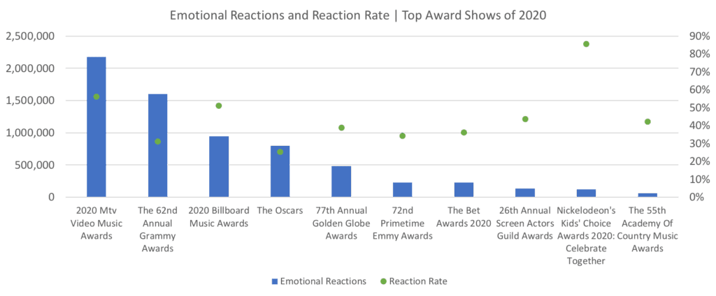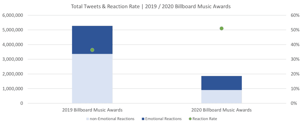 - Despite the lower performance in both Total Tweets and Emotional Reactions, the 2020 Billboard Awards increased in Reaction Rate in 2020 from 36% in 2019, to 51% in 2020, a 15% increase