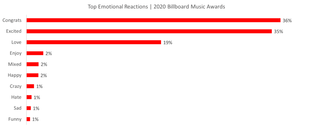 - The highest performing Emotional Reactions for the 2020 Billboard Awards were ‘congrats’ (36% of all Emotional Reactions), ‘excited’ (35% of all Emotional Reactions), and ‘love’ (19% of all Emotional Reactions)