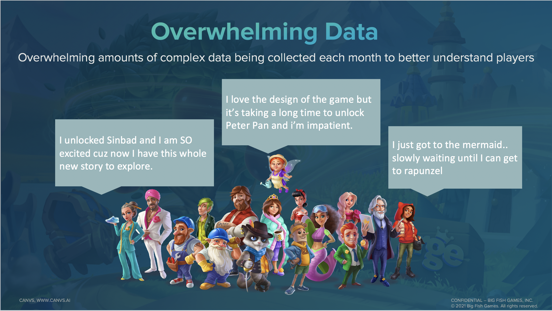Sarah Gurbach, Consumer Insights Manager from Big Fish Games, captured the challenge they faced during the presentation: “When you're in the millions [of open ends], it's really difficult to quantify and group all of those different characters into one category. [With Canvs] I can monitor it and go back to the game teams and say yeah, players are talking about it and the sentiments positive or negative.”