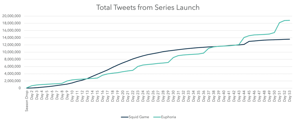 Looking below at an aggregating graph of Total Tweets for Euphoria and Squid Game, you will notice two separate and distinct trends between the two programs following their initial launches. For the sake of this study, consider Day 1 in the chart below to represent the day Squid Game dropped on Netflix, and the release day of Season 2 of Euphoria.