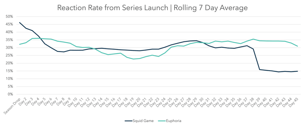 - While the weekly release cadence of Euphoria created more plateaus in online Reactions early in the season, engagement heavily spiked towards the end of a show’s season causing it to outperform even the most viral, binge-able shows