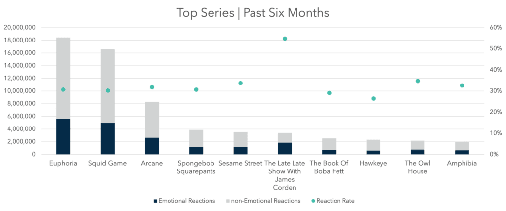 Over the last six months, Euphoria and Squid Game have dominated all other series in generating Total Tweets and Emotional Reactions