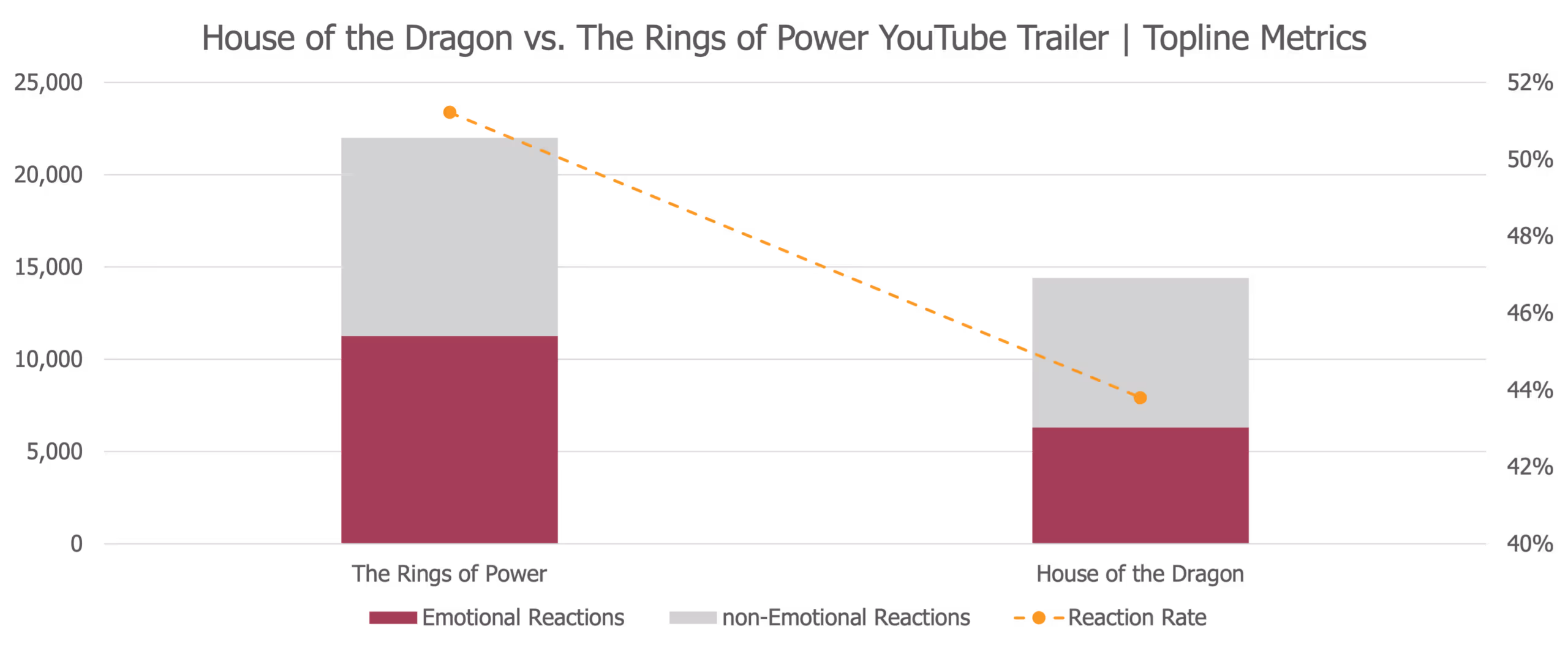 - On YouTube, The Rings of Power trailer has outperformed House of the Dragon across all major metrics: earning 78% more Emotional Reactions, 53% more Total Comments, and a 7% higher Reaction Rate