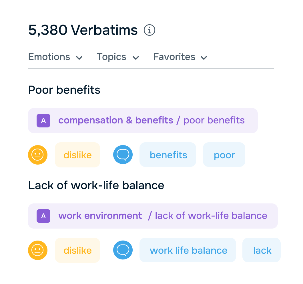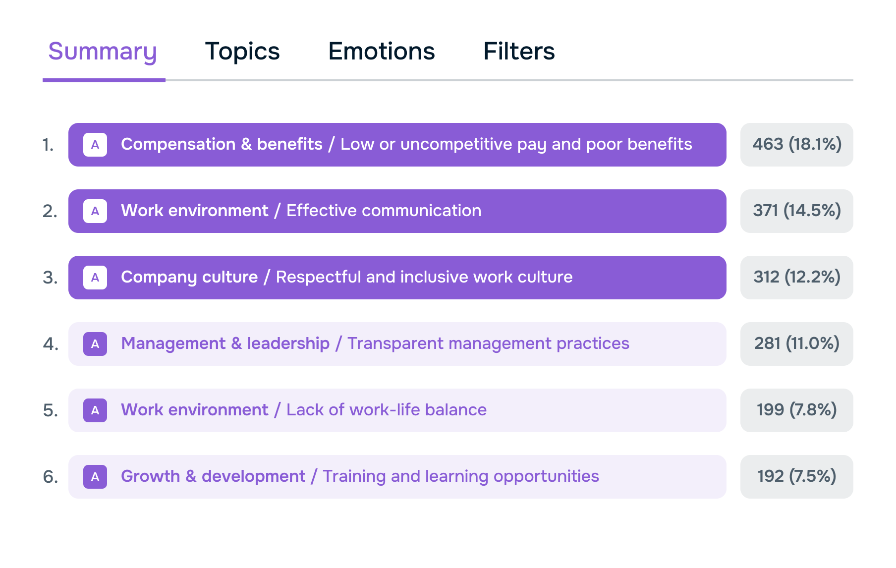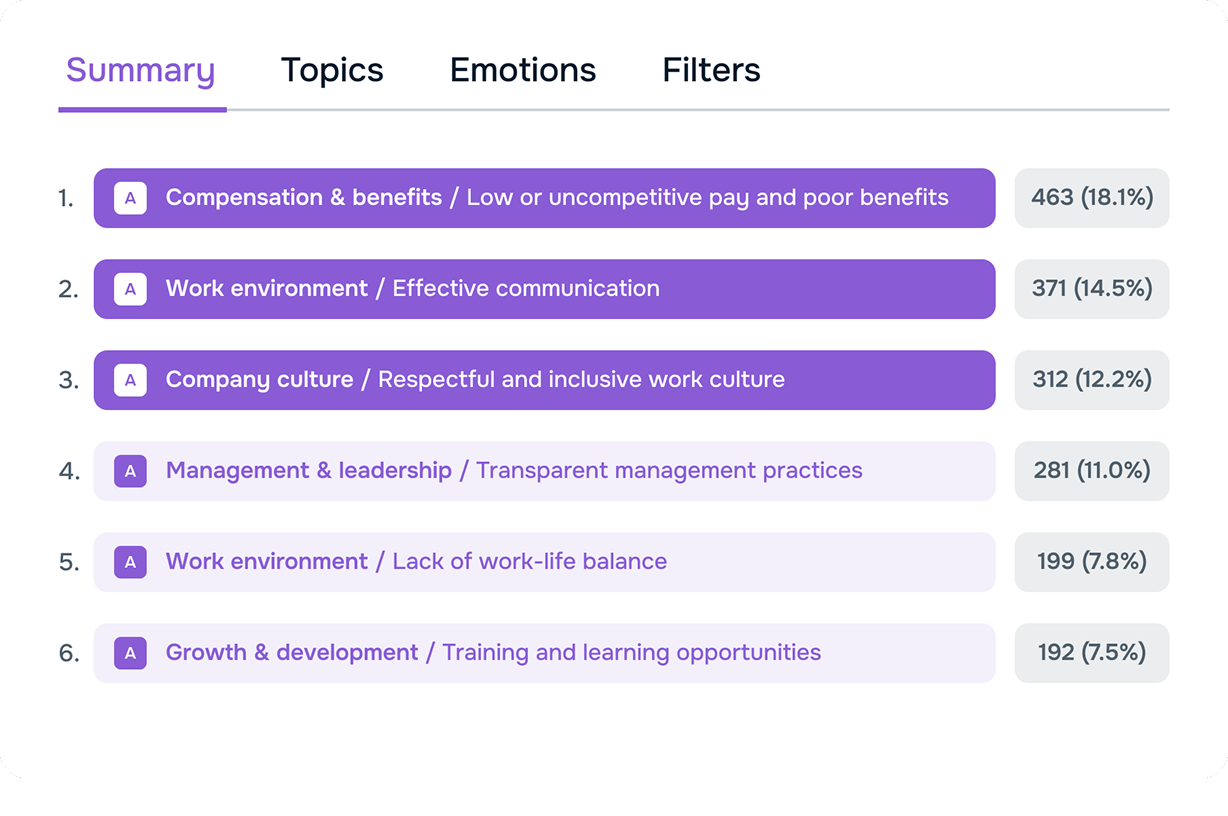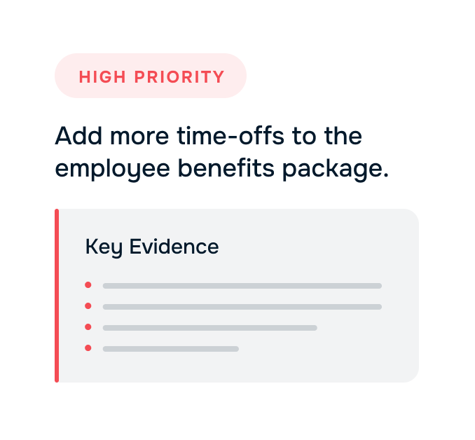 Turn thousands of comments into priorities you can act on, from friction points to emerging culture risks, and translate them into lasting improvements.